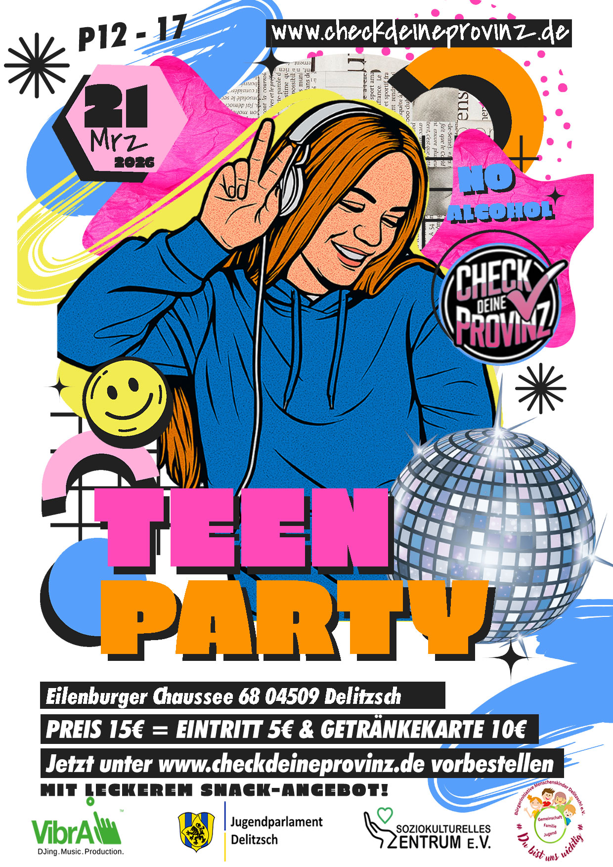 Der Eintritt inklusive einer Getränkekarte (kein Alkohol) im Wert von 10€ kostet nur 15 € – ein unschlagbares Angebot, das du jetzt bequem online unter www.checkdeineprovinz.de vorbestellen kannst! Diese Veranstaltung kombiniert Spaß und Gemeinschaft, unterstützt von engagierten Partnern, die sich für die Jugend einsetzen. Tickets sind begrenzt – also sei schnell dabei! Weitere Infos findest du vor Ort oder auf www.checkdeineprovinz.de. Gemeinsam machen wir Delitzsch zum Party Hotspot für Euch.