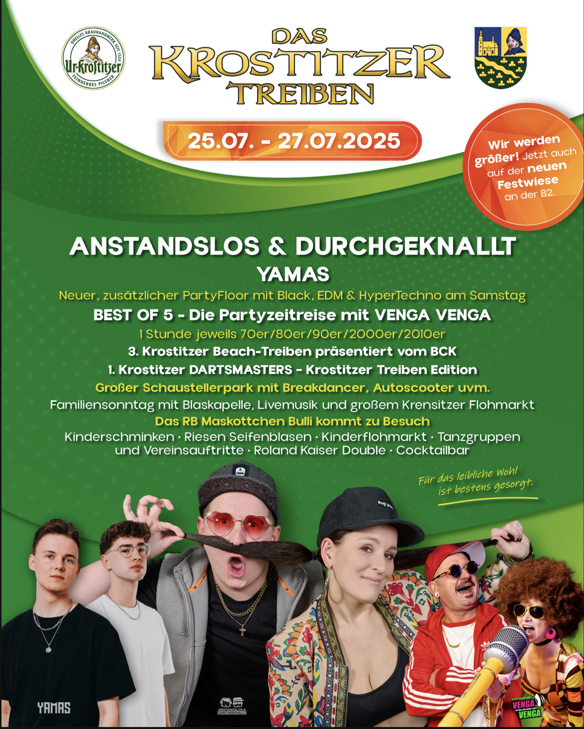 Der Online VVK für das Krostitzer Treiben ist beendet. Es gibt bis Freitag (25.07.25) Abend weiterhin Vorverkaufskarten im stationären VVK bei Nahkauf in Krostitz, sowie die reguläre Abendkasse direkt auf dem Event. Zeitiges Kommen lohnt sich. Viel Spass!